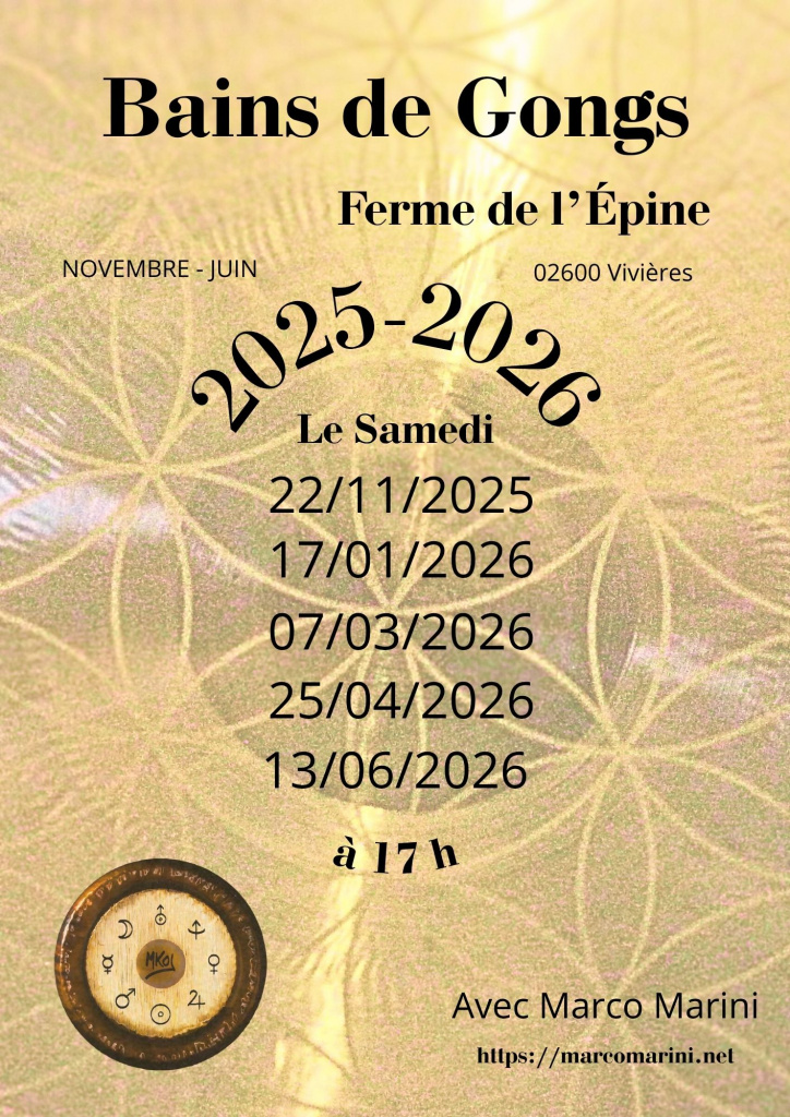 Bains de Gongs avec Gongs planétaires, chinois et symphoniques. Bains de bols avec bols de l’Himalaya, koshi, carillons, cloches, bols de cristal… Bains de son avec bols de l’Himalaya, bols cristal, gongs portés, percussions, shruti box, appeaux…